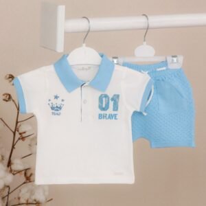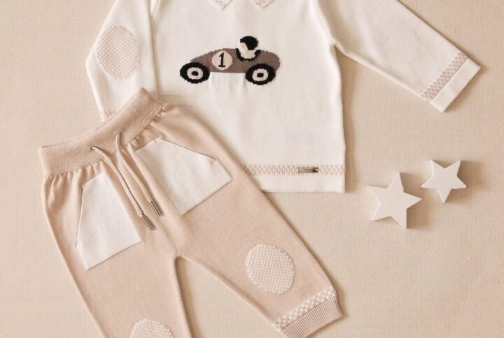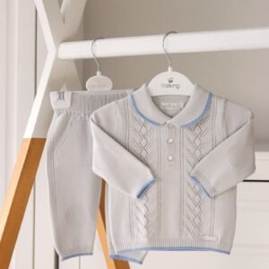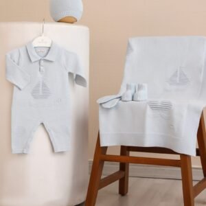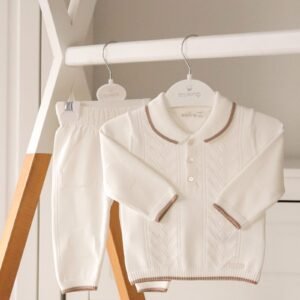 Set sail in timeless style with this handcrafted 2-piece knitwear set for baby boys. Featuring a long-sleeve collared top with an elegant button-down detail and a classic sailboat knit design, this outfit blends softness and sophistication in one cozy look.