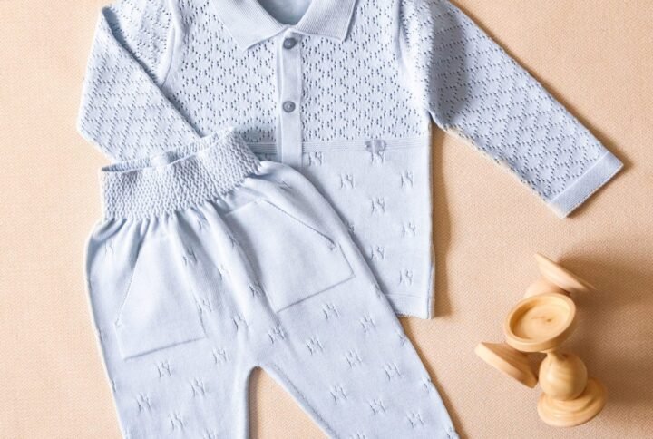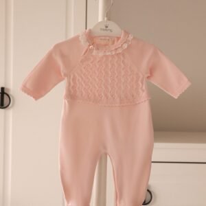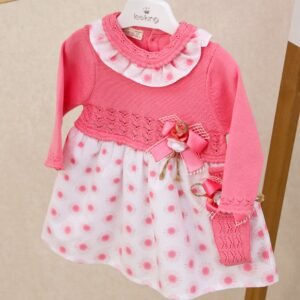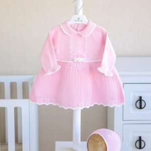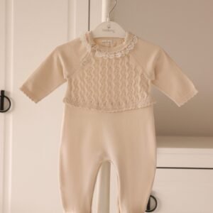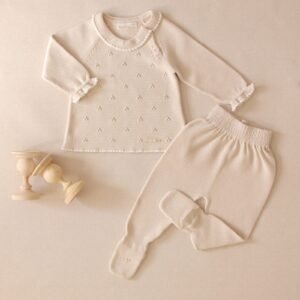 Wrap your little star in cozy elegance with the Starry Snuggles Knit Set. This two-piece outfit features a beautifully detailed long-sleeve knit top with a delicate lace-trimmed collar and dainty diamond-pattern design. The matching footed pants are finished with sweet bow accents, keeping tiny toes warm while adding a touch of charm.